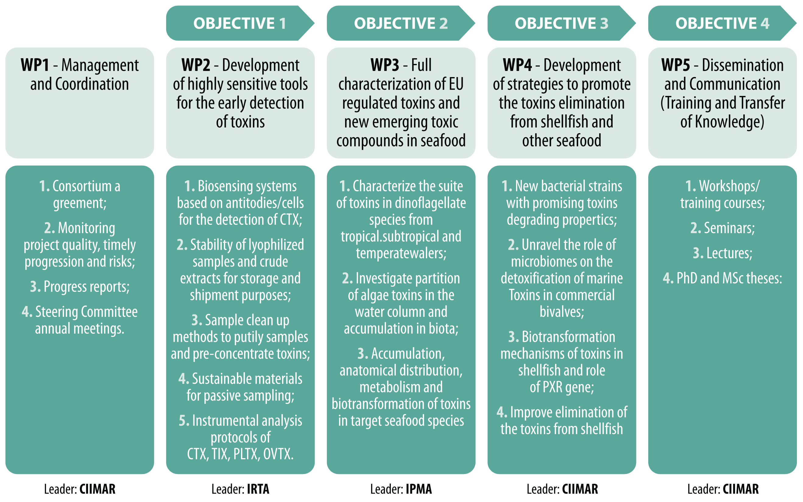 BlueShellfish activities taking place are organized into 4 work packages. Each WP tackles one of the 4 main objectives of the project.